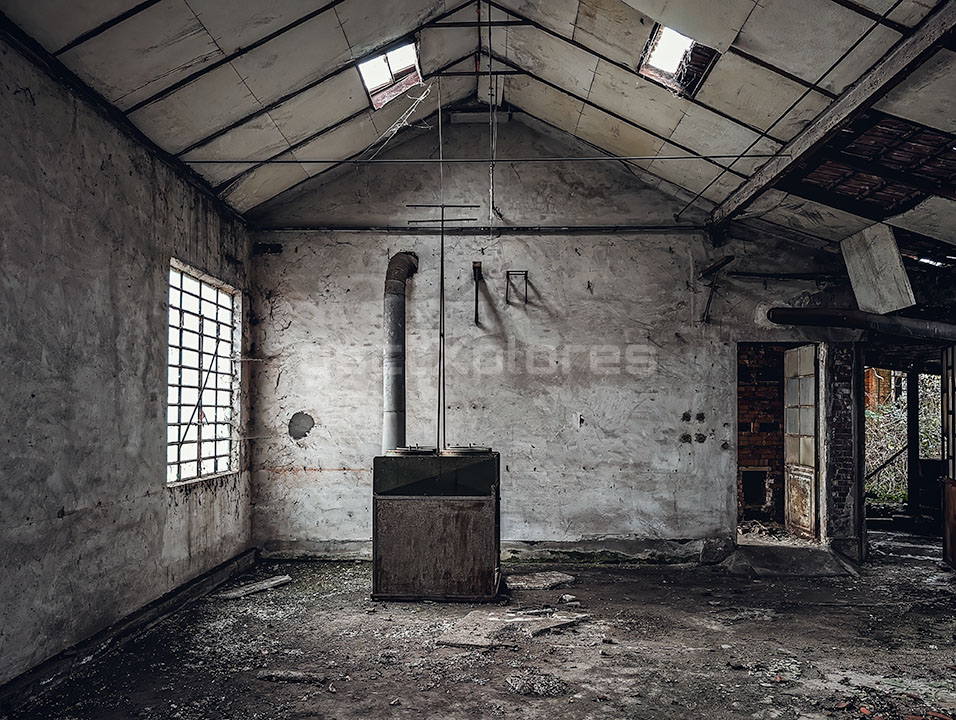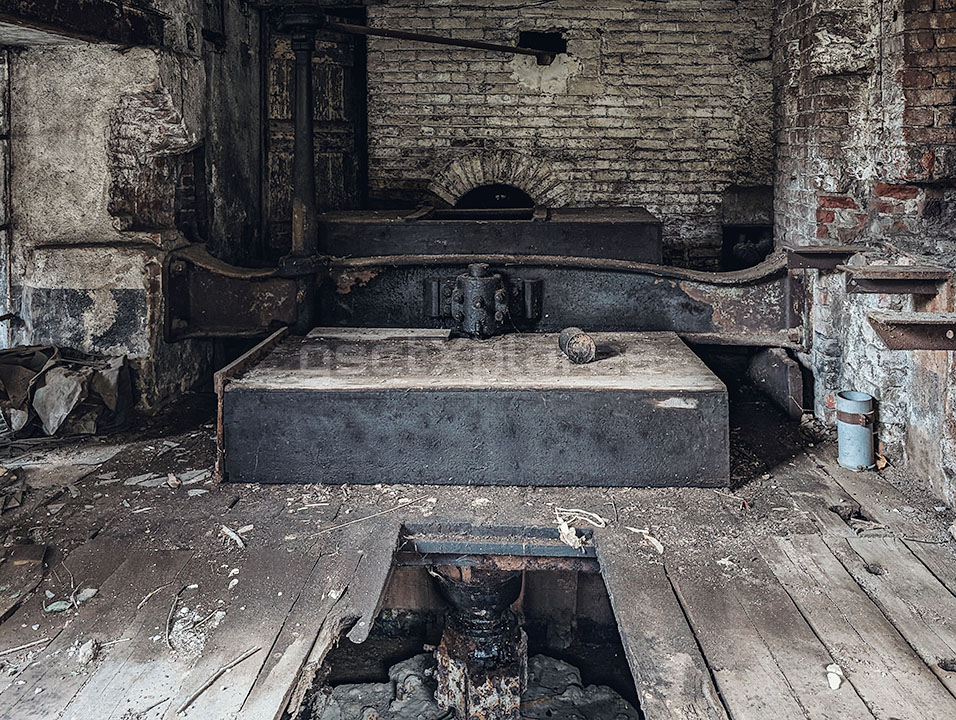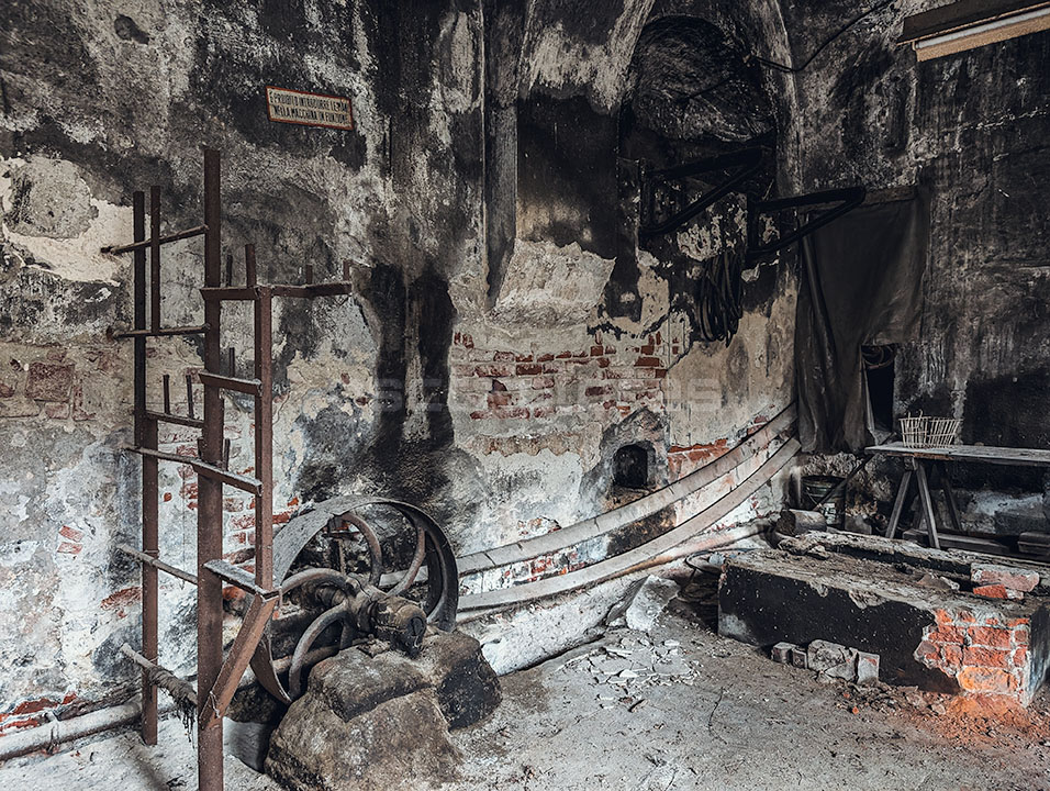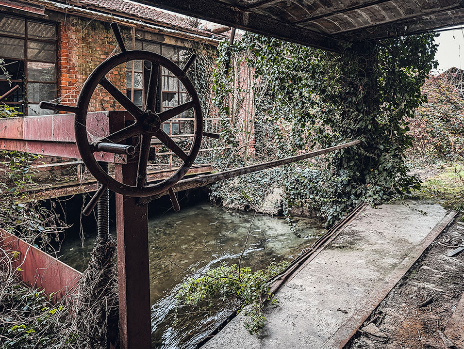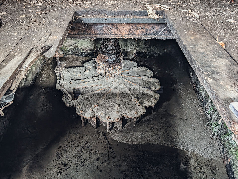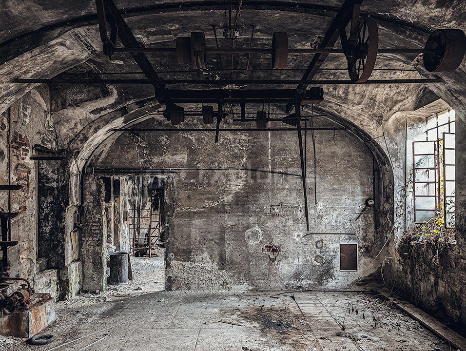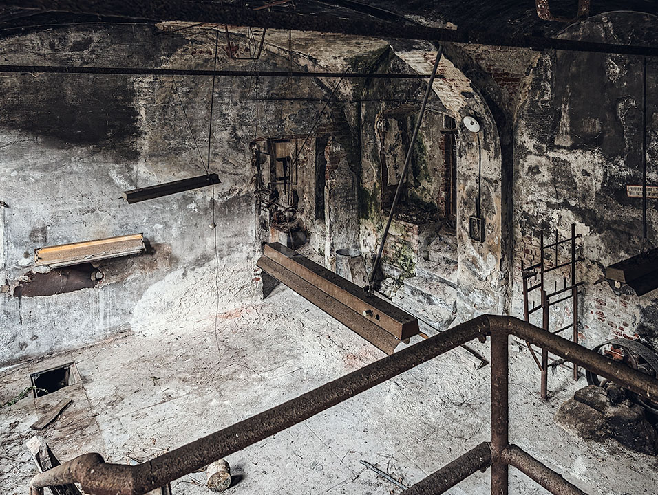A horizontal water mill powered this old factory. The mill (which is still intact) is currently covered in a thick layer of mud. Although principally water powered, at some stage the factory was modernized and received electrical power. Conveyer belts and gears are scattered throughout the factory, most probably powering the old (and now non existent) machinery. Only a green silo remains, ominously guarding the room it stays in. During the explore, no documents or anything really could be found. Only a few tables and signs.