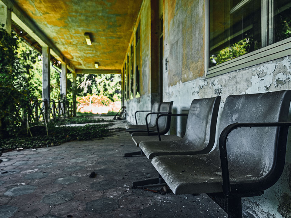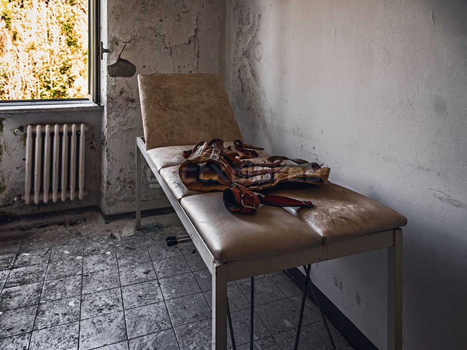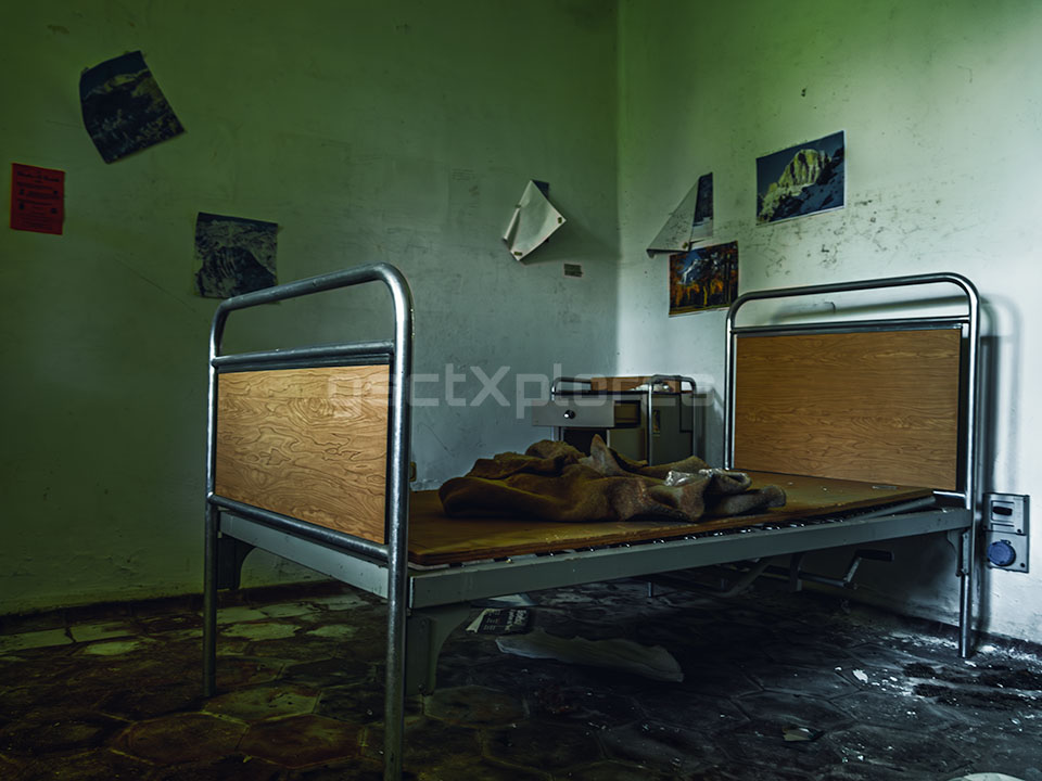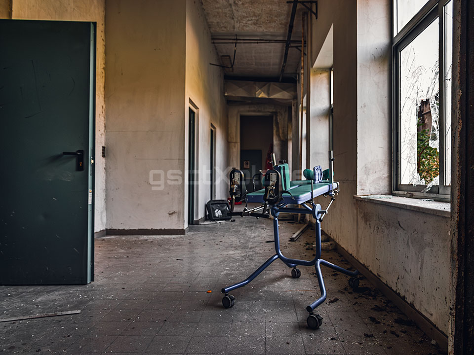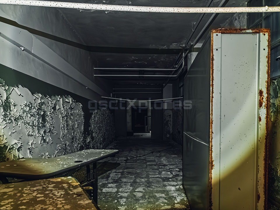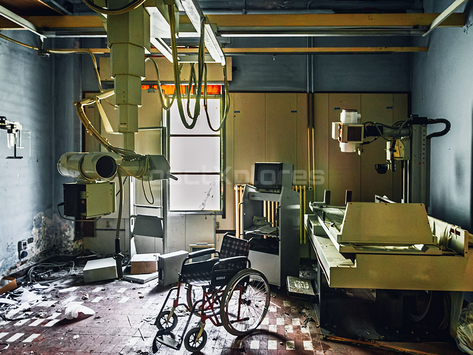 Inside, the remnants of its medical past remain scattered throughout the corridors: wheelchairs, gurneys, and medical instruments lay abandoned, offering a haunting glimpse into its former role as a healthcare facility. The x-ray room still contains two machines and the lead glass shield used to protect doctors during examinations. An adjacent building features an oval spiral staircase leading to former training rooms for nurses.