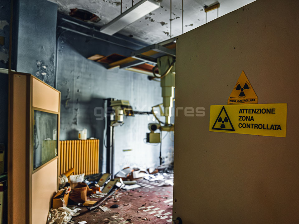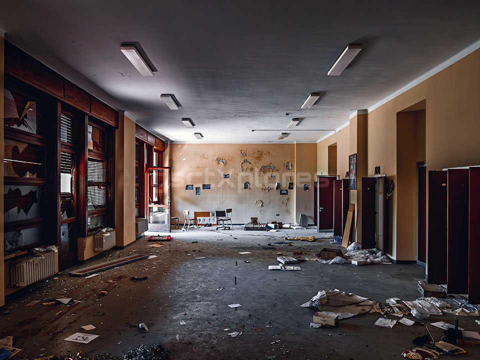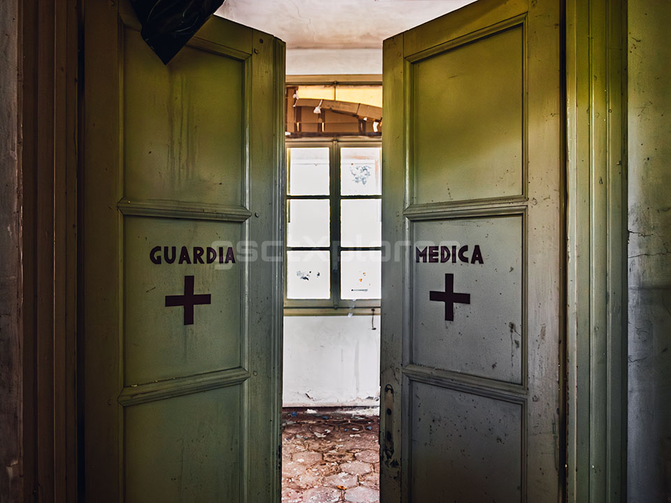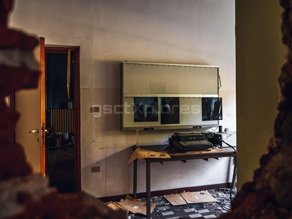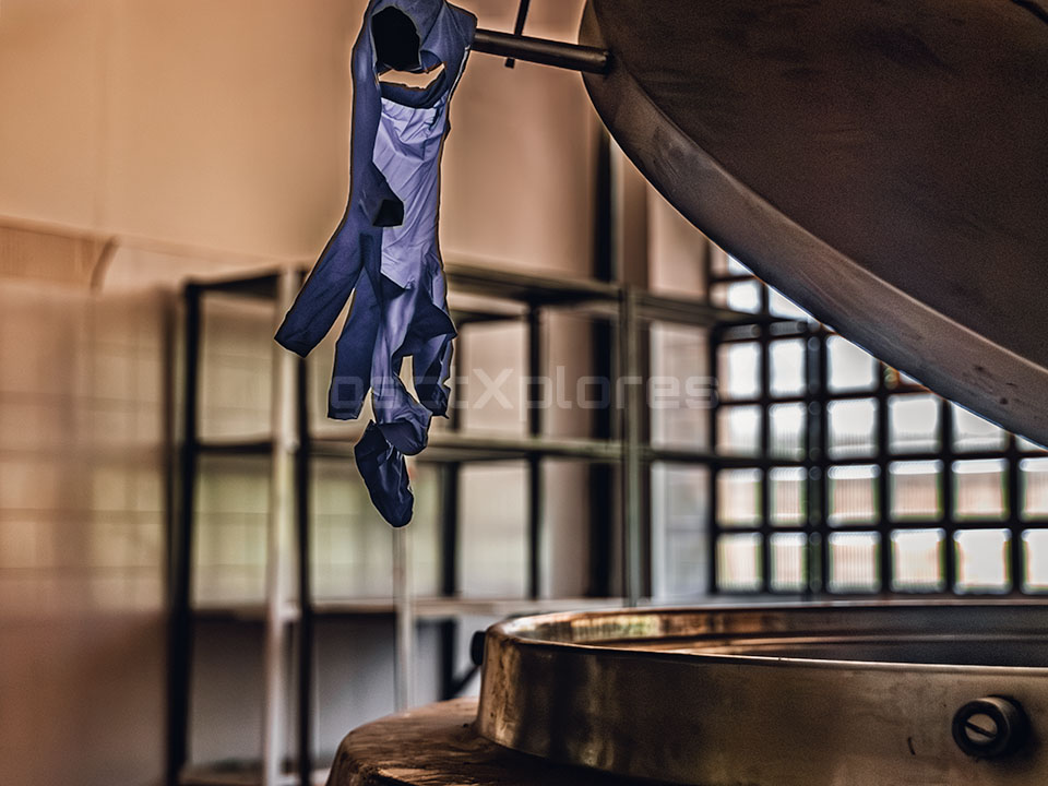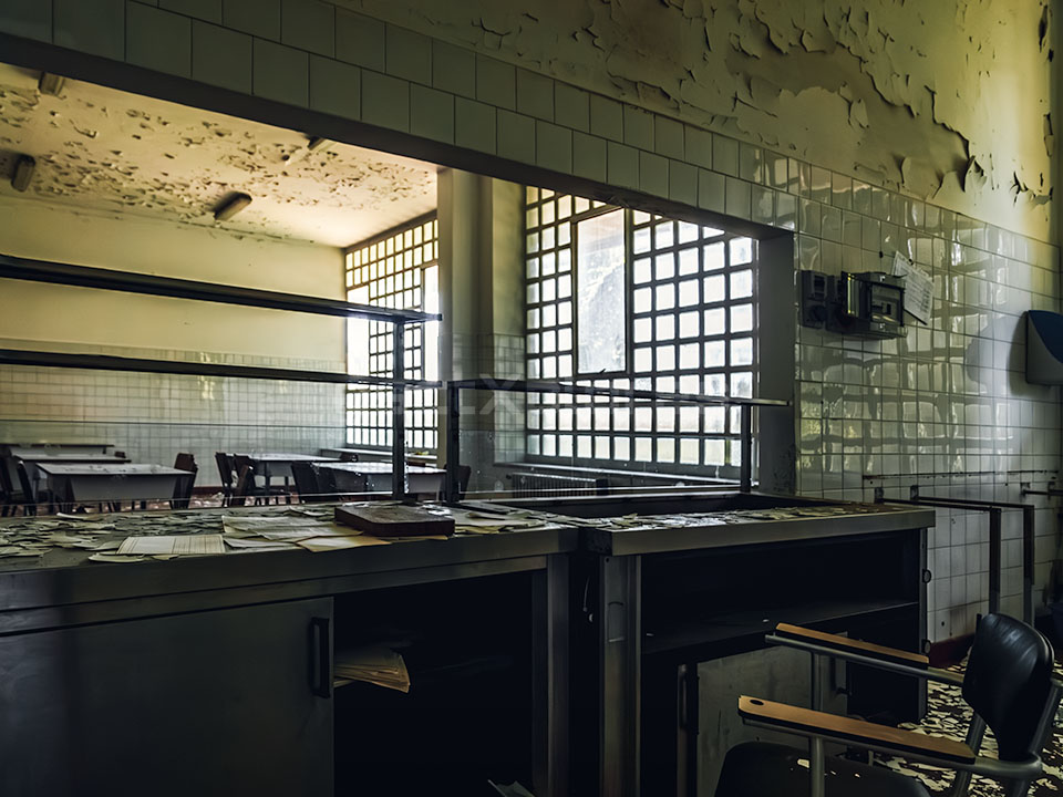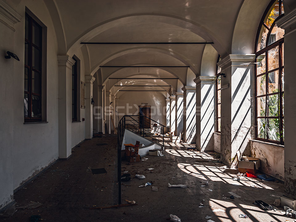 Inside, the remnants of its medical past remain scattered throughout the corridors: wheelchairs, gurneys, and medical instruments lay abandoned, offering a haunting glimpse into its former role as a healthcare facility. The x-ray room still contains two machines and the lead glass shield used to protect doctors during examinations. An adjacent building features an oval spiral staircase leading to former training rooms for nurses.