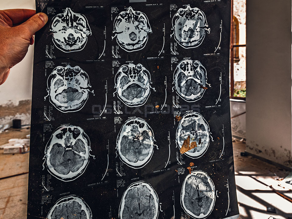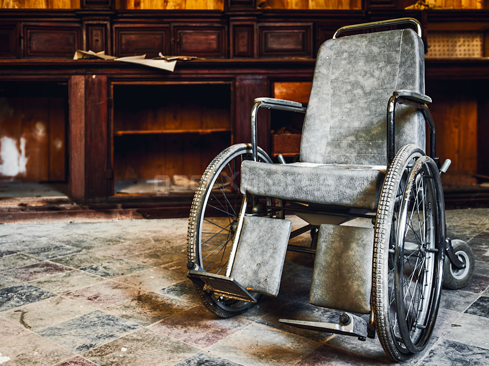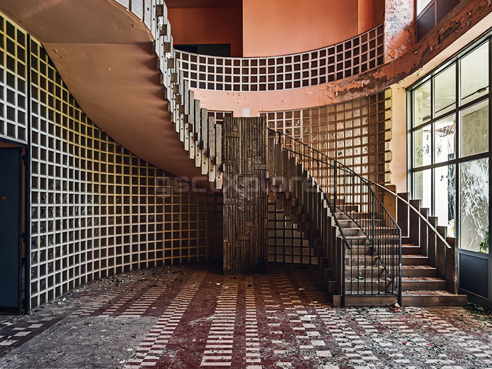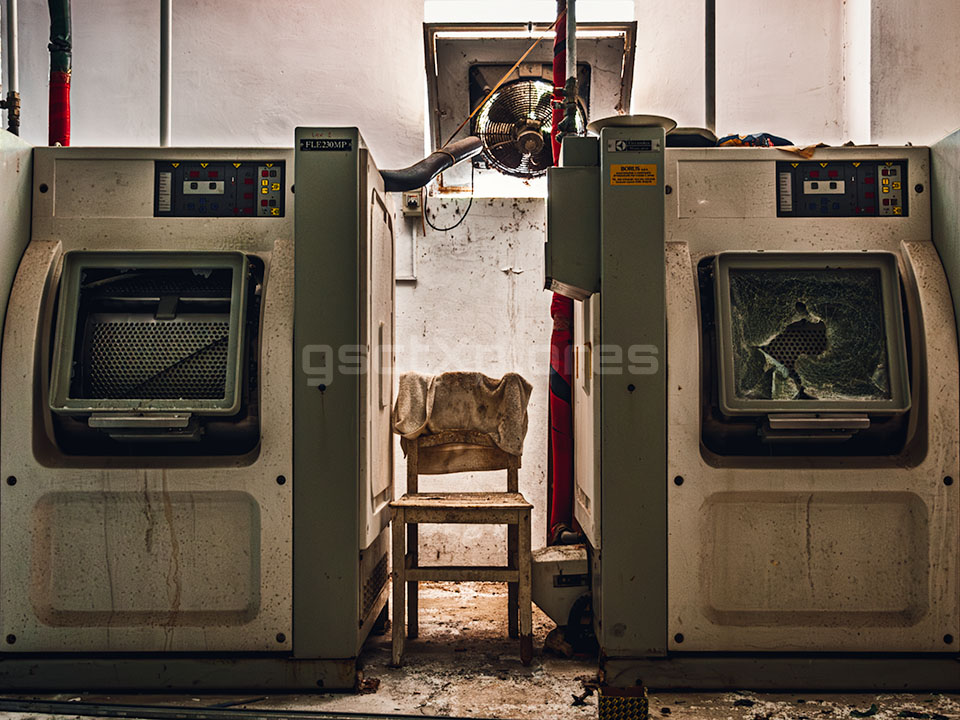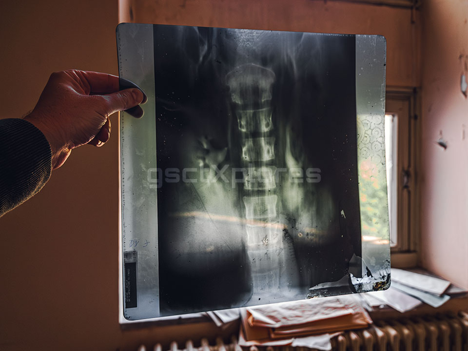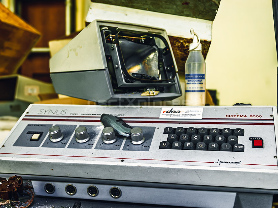 Inside, the remnants of its medical past remain scattered throughout the corridors: wheelchairs, gurneys, and medical instruments lay abandoned, offering a haunting glimpse into its former role as a healthcare facility. The x-ray room still contains two machines and the lead glass shield used to protect doctors during examinations. An adjacent building features an oval spiral staircase leading to former training rooms for nurses.