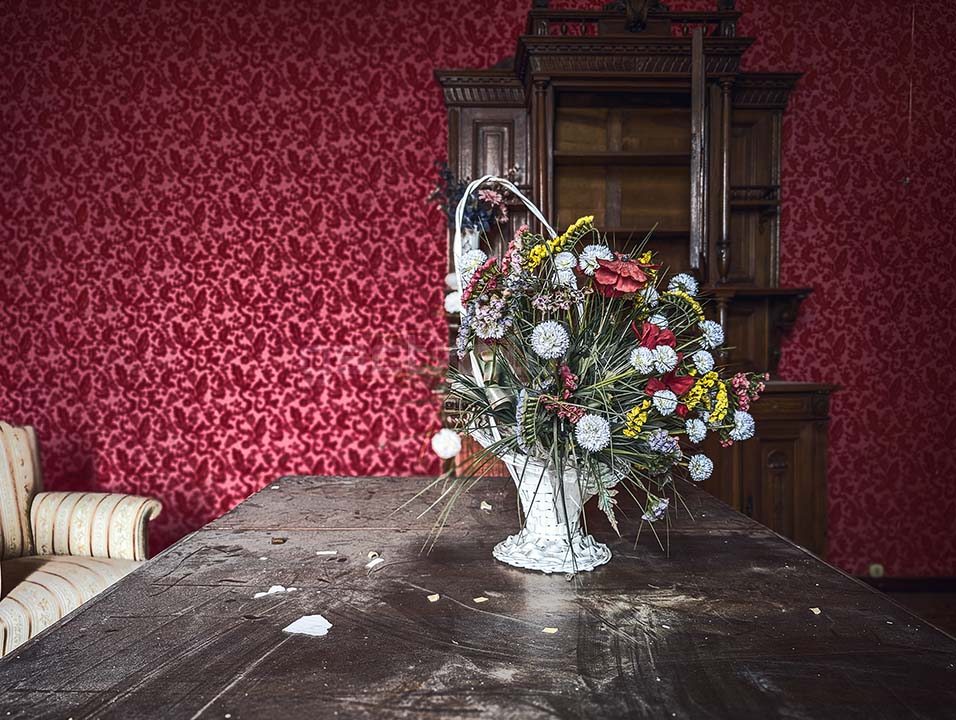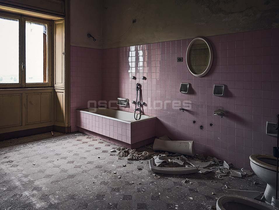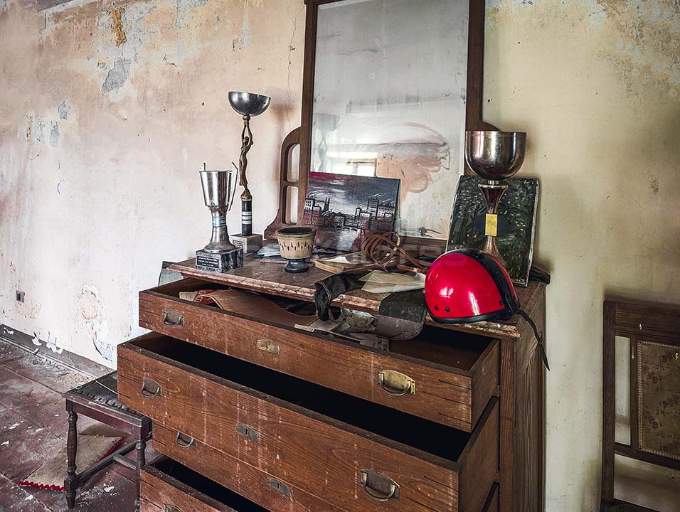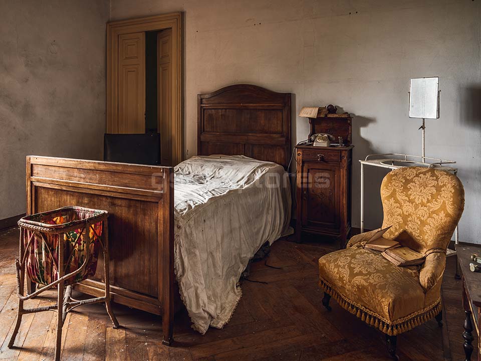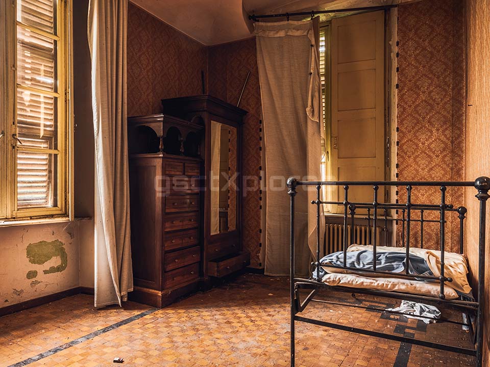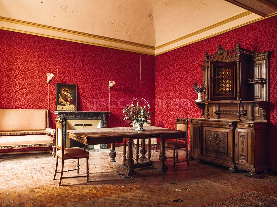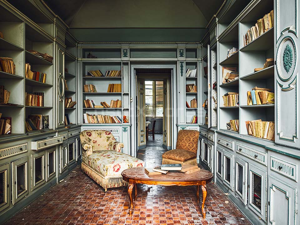 On the first floor, there are two additional salons and a billiard room, all featuring original parquet flooring from the period. There is also a mezzanine level, which was once used as quarters for the staff, and the noble floor, where bedrooms, a library, and studies are located. The large kitchens can still be seen in the basement. The library, quite easily the most impressive part of the villa, contains furniture, books, family photos and an archive of documents describing the last residents of the building. Not only does the library impress, the bedrooms, and living areas are all, amazingly, still furnished. Beds are made and lush furniture reminds us of the once vast wealth of the previous owners, of which there have been many, from aristocrats to business entrepreneurs. However, all the chandeliers are missing….sorry….sold.